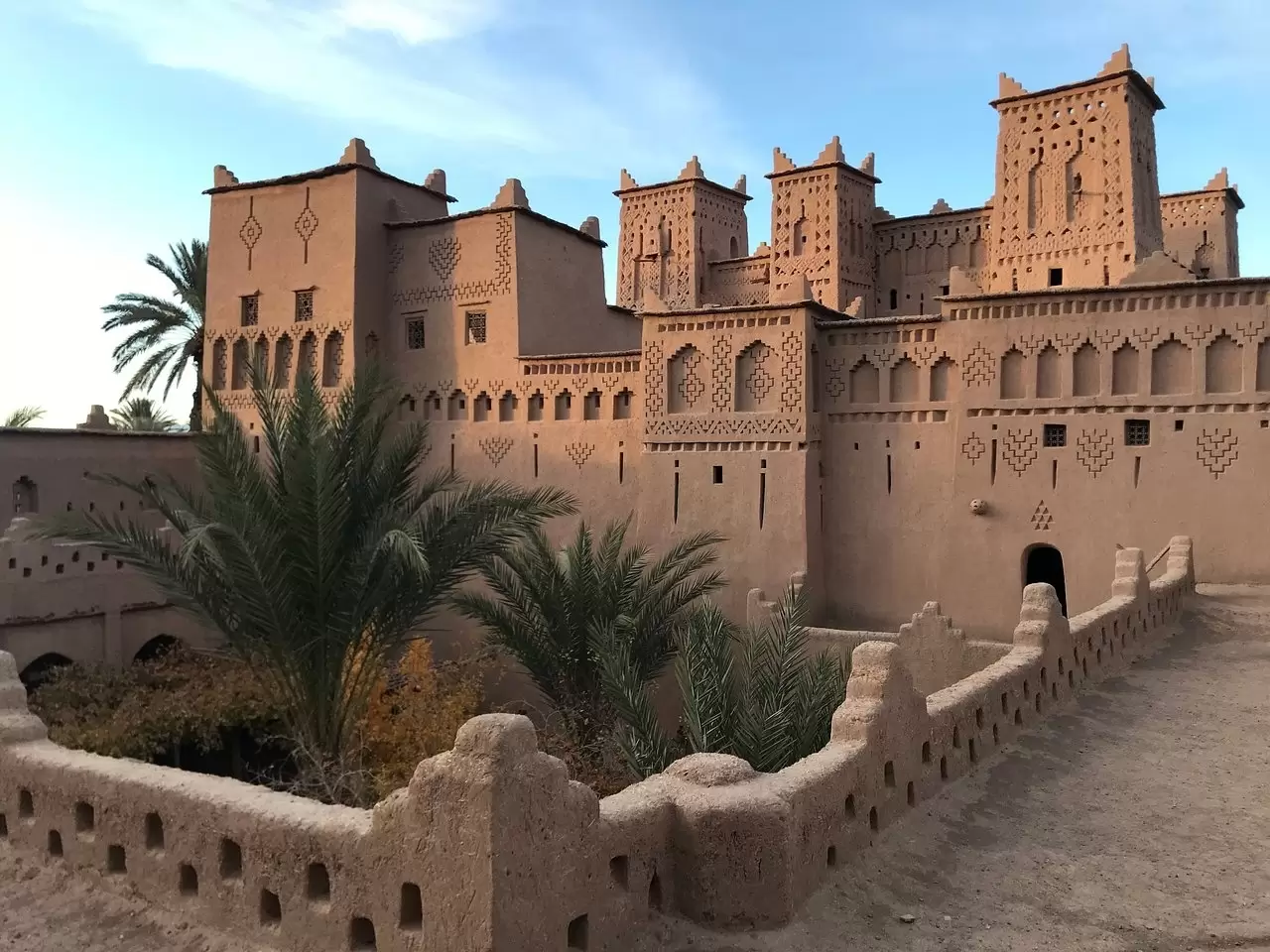 Por la mañana volveremos en dromedario al hotel para desayunar. Desayuno y visita a Khamlia, pueblo originario de Mali, donde relajarnos con un té mientras disfrutamos de un pequeño concierto de música gnawa. seguidamente llegaremos a Rissani, con su interesante mercado, donde acuden los nómadas de los alrededores para vender su ganado y compra los enseres que necesitan visitaremos el Mercado de la ciudad de Rissani donde podemos encargar también Pizza Bereber (Empanada rellena) para comer por el camino baño un árbol en el desierto Nergo Hamada. El resto del día lo utilizaremos para volver a Ouarzazate a través del valle del Draa, uno de los ríos más largos de Marruecos.  Paradas para contemplar las encantadoras kasbahs de adobe y aldeas beréberes que salpican la ruta y las interesantes formaciones geológicas del Valle del Draa. Cena y noche en Ouarzazate.